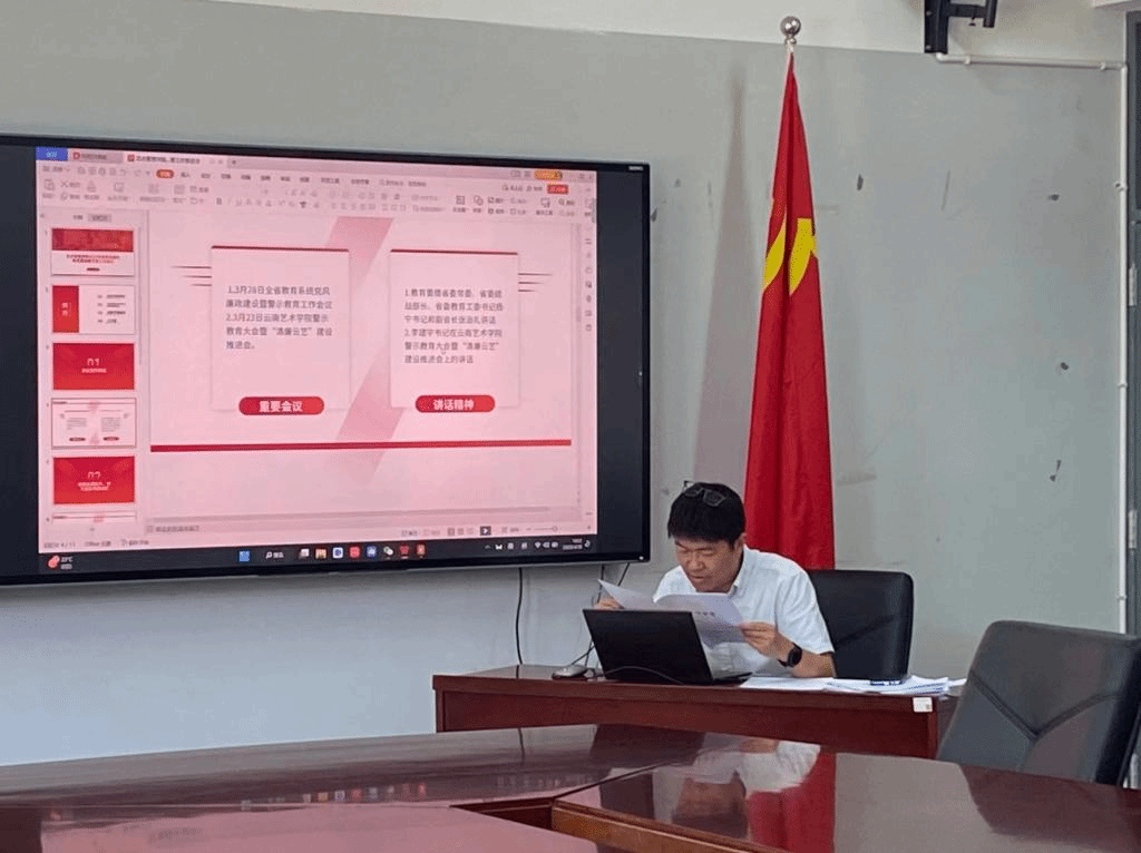 会议共有四项议程,第一项议程,传达了2023年全省教育系统党风廉政建设暨警示教育工作会议、云南省教育系统党风廉政建设暨警示教育工作会议、伟德国际bevictor官方网站警示教育大会暨“清廉云艺”建设推进会的要求和精神。组织学习《省委教育工委、省教育厅、驻省教育厅纪检监察组在伟德国际bevictor官方网站召开警示教育大会》、《教育要情》、《严实相济·久久为功,加快建设一流艺术院校提供坚强保证》等系列文件。