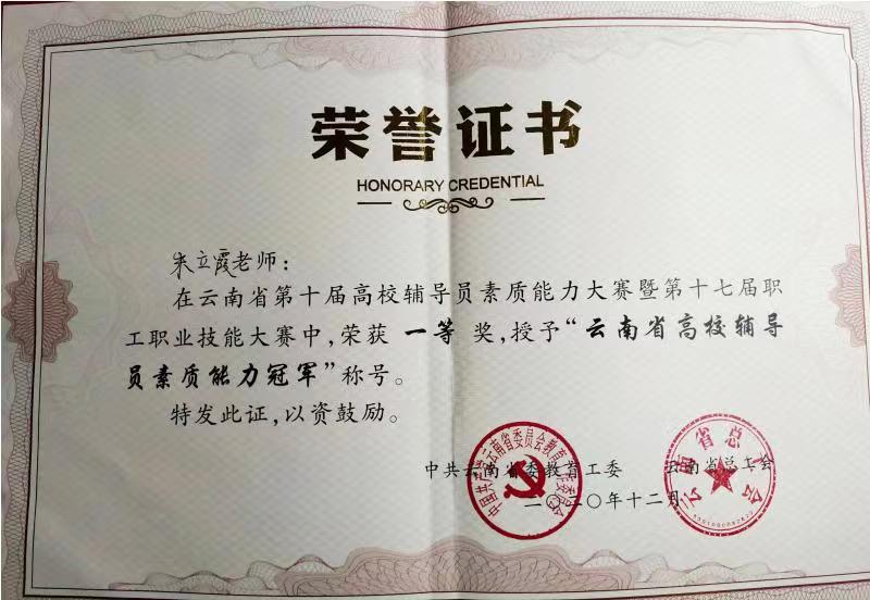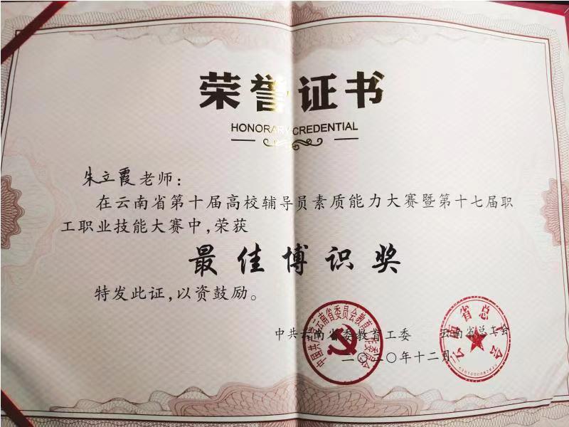第十届云南省辅导员素质能力大赛于2020年12月3日至4日在西南林业大学顺利举办。伟德国际bevictor辅导员朱立霞老师以云南省总决赛第一名的成绩荣获大赛“一等奖”和“最佳博识奖”,并荣获由省委教育工委和省总工会授予的“云南省高校辅导员素质能力冠军”称号。