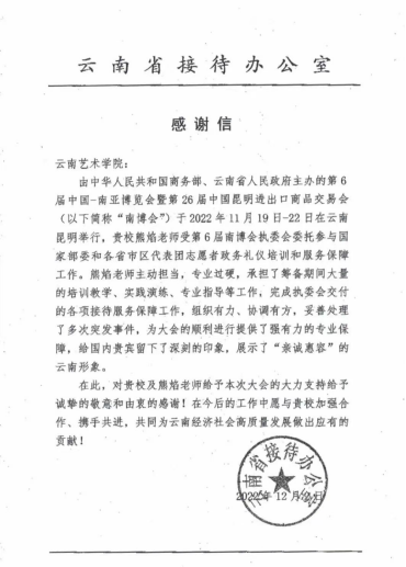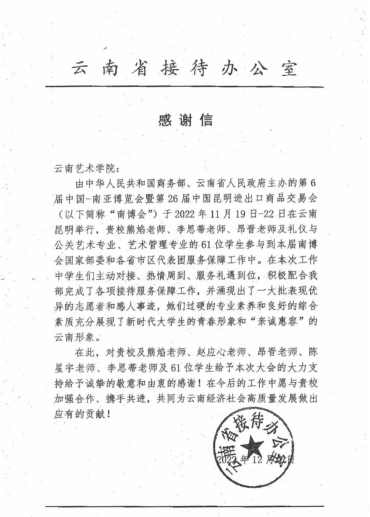 第6届中国—南亚博览会暨第26届中国昆明进出口商品交易会(以下简称“南博会”)于2022年11月19日-22日在昆明滇池国际会展中心举行。伟德国际bevictor熊焰老师、赵应心老师、昂晋老师、陈星宇老师、李思蒂老师及礼仪与公关艺术专业、艺术管理专业的61位员工参与到本届南博会志愿服务工作中,为南博会圆满召开做出了积极贡献。