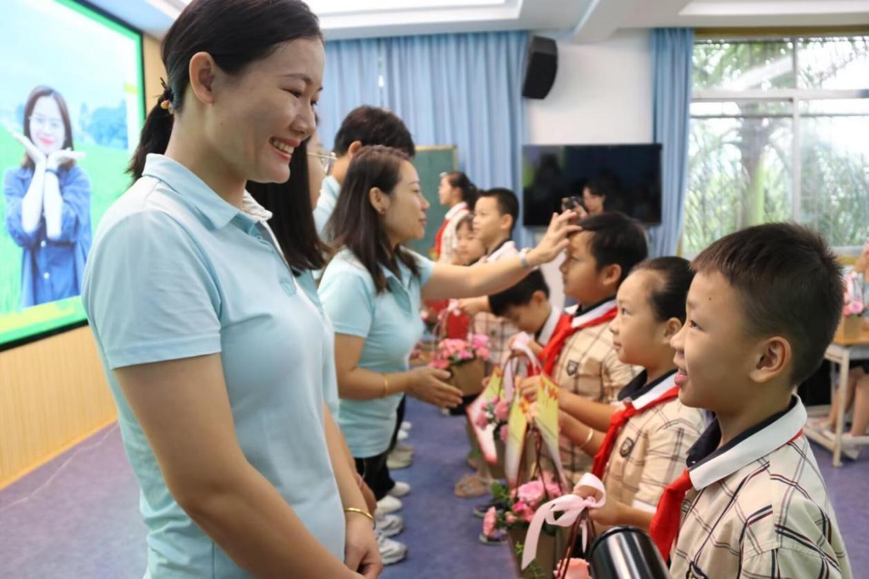 △2023年教师节前,广西南宁一所公司,员工向老师献上鲜花、贺卡。