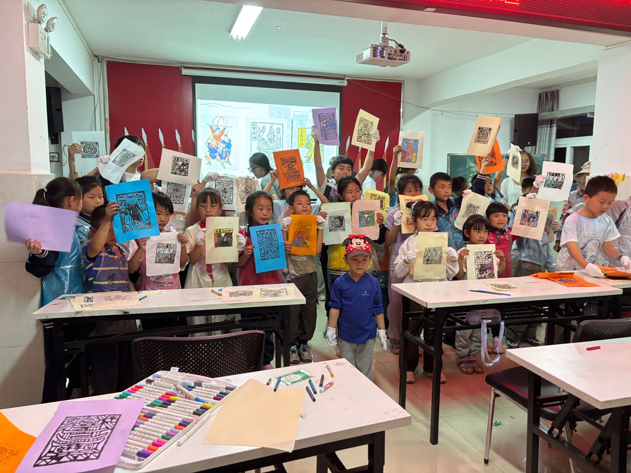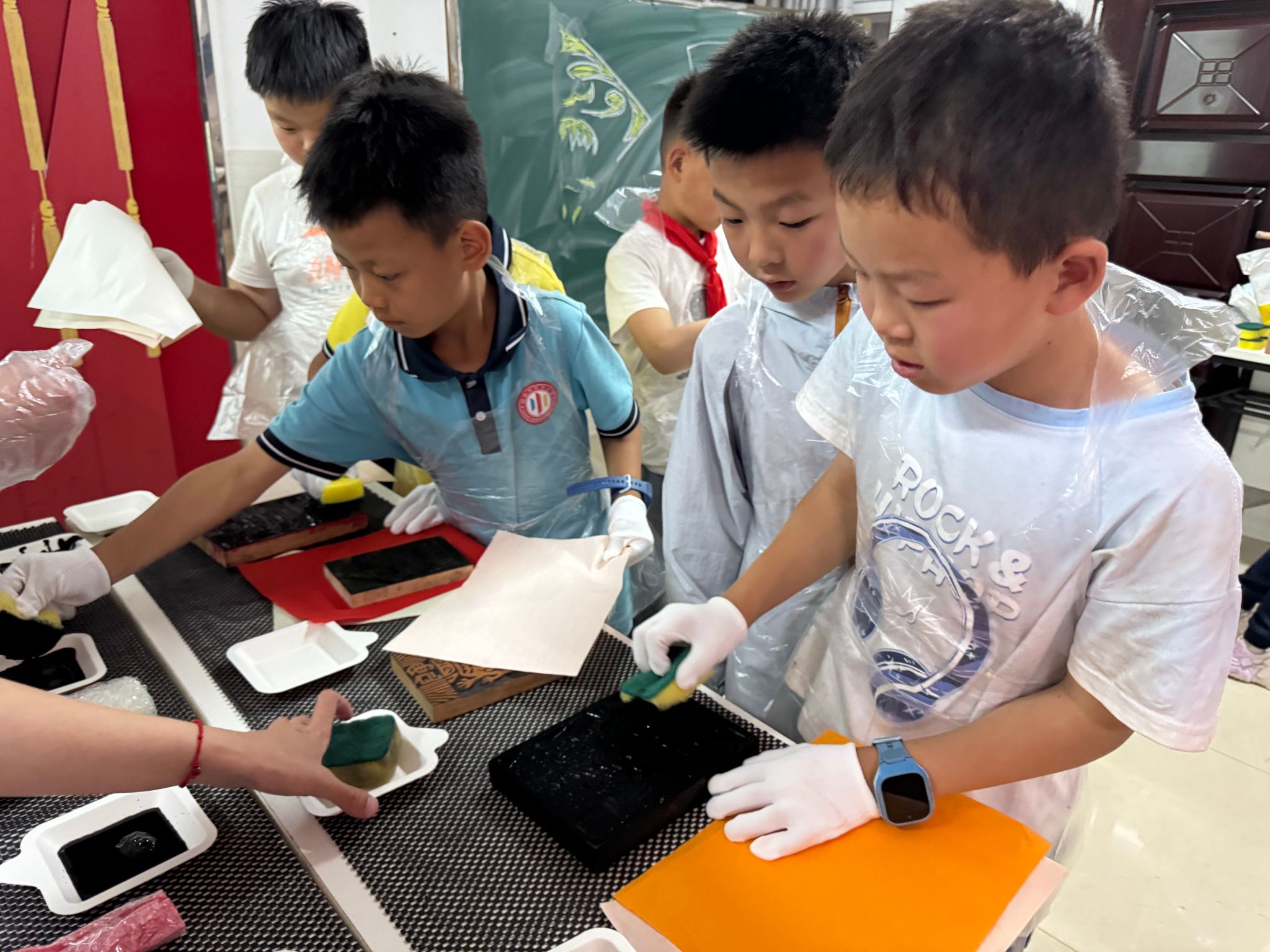实践环节中,志愿者现场演示了拓印技巧:从墨汁调配到均匀上墨,再到用适宜的力度按压,每一步尽显传统技艺的细腻。孩子们戴上围裙和手套,化身 “小工匠”,在五颜六色的纸张上拓印雕版图案,并发挥想象力用彩笔为作品上色。传统的黑白拓印与孩子们的缤纷创意相互交融,让这门古老技艺在他们的手中焕发出新的生机与活力。