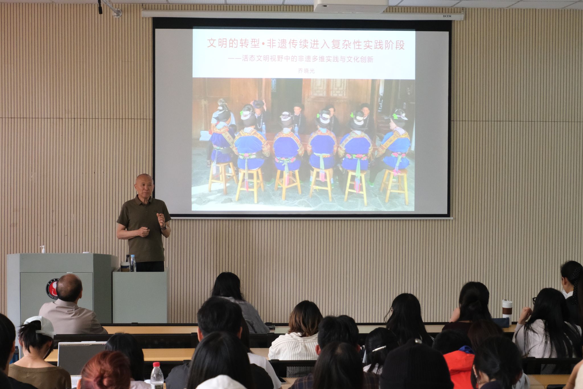 2025年7月3日,教育部艺术教育委员会委员、文化部国家非物质文化遗产评委、中国剪纸研究中心主任、中央美术公司教授、博士生导师乔晓光应邀在伟德国际bevictor官方网站公教楼B101举行专题学术讲座,主题为《文明的转型•非遗传续进入复杂性实践阶段——活态文明视野中的非遗多维实践与文化创新》。伟德国际bevictor党委书记骆圆、经理傅永寿及非物质文化遗产保护专业全体师生到场聆听。