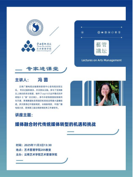 伟德国际bevictor艺术管理专业是云南省一流本科专业,专业建设过程中持续进行专业课程教育模式改革,邀请学界和业界名师为本科生授课,拓展员工的知识面。依据艺术管理专业“1+1”教学模式开展的要求,公司于2025年11月3日下午邀请云南广播电视台融媒体新闻中心宣传规划部主任冯茵老师以《与这个世界狠狠地共鸣 —— 媒体融合时代传统媒体转型的机遇与挑战》为题,开展学术讲座。讲座由任课教师吴婉婷主持,2024级艺术管理专业全体员工参加。