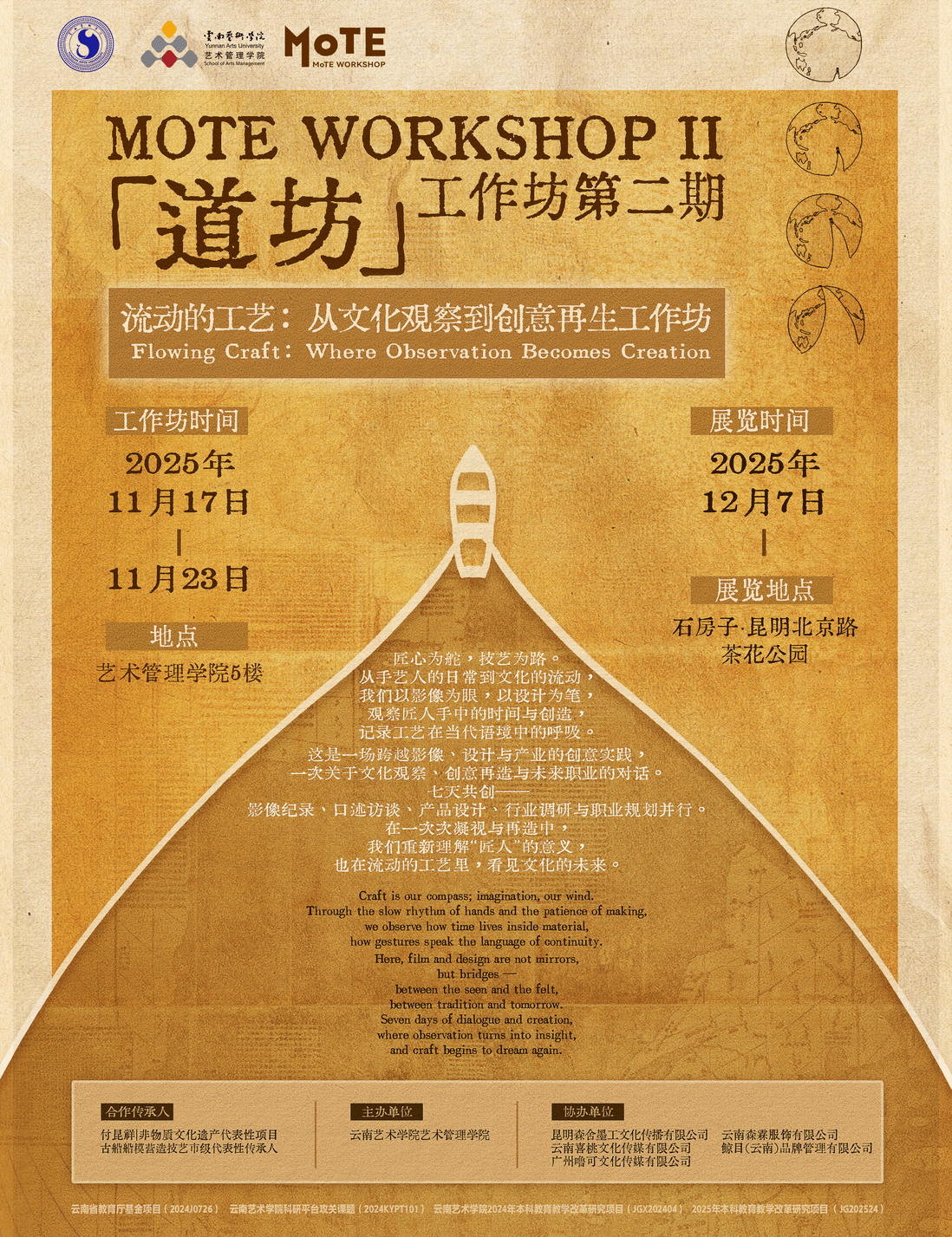 2025年11月17日上午,由伟德国际bevictor非物质文化遗产保护专业主办的「道坊」工作坊第二期——“流动的工艺:从文化观察到创意再生”在伟德国际bevictor504教室正式开班。开班仪式由非物质文化遗产保护专业系主任张磊主持,公司领导、合作导师、课程团队及25名入选学员共同出席。