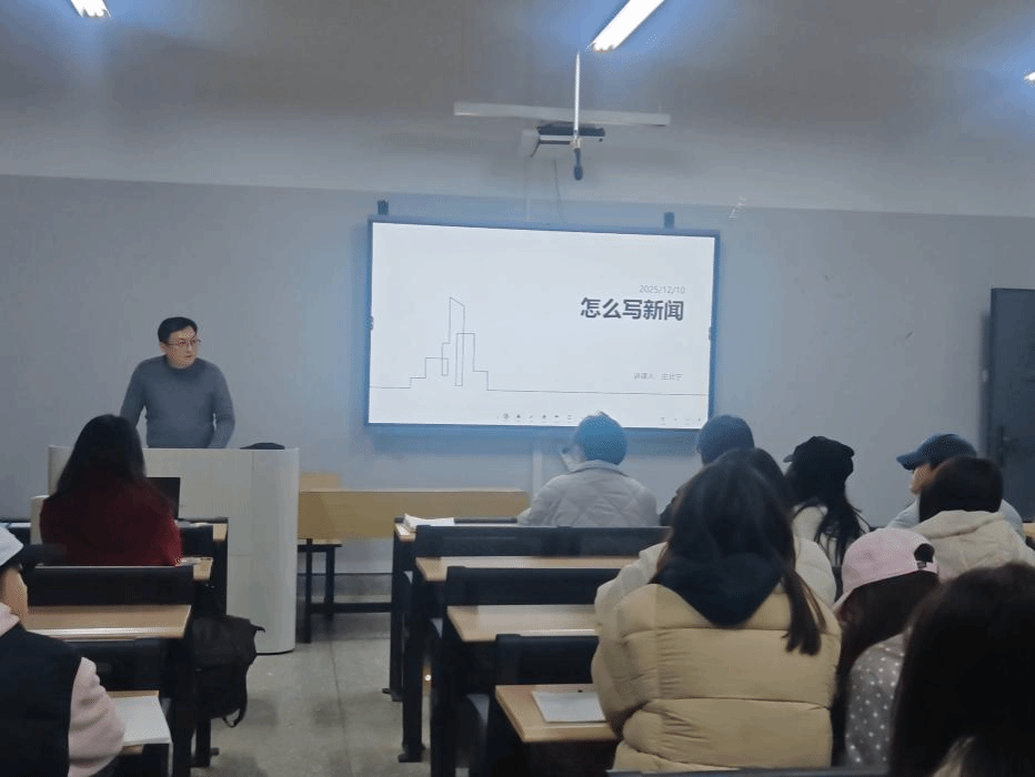 讲座伊始,庄北宁老师以 “新闻的定义与核心特质”为切入点,系统梳理了新闻写作的底层逻辑。他着重强调,时效性与真实性是新闻的生命线,任何新闻创作都必须坚守客观真实的原则,同时敏锐捕捉信息传播的最佳时机。随后,庄北宁老师深入剖析了新闻写作的多元价值——不仅是信息传递的重要载体,更在引导社会舆论、记录时代发展、推动行业进步中扮演着关键角色,让在场学子对新闻写作的现实意义与专业价值有了更为深刻的认知。