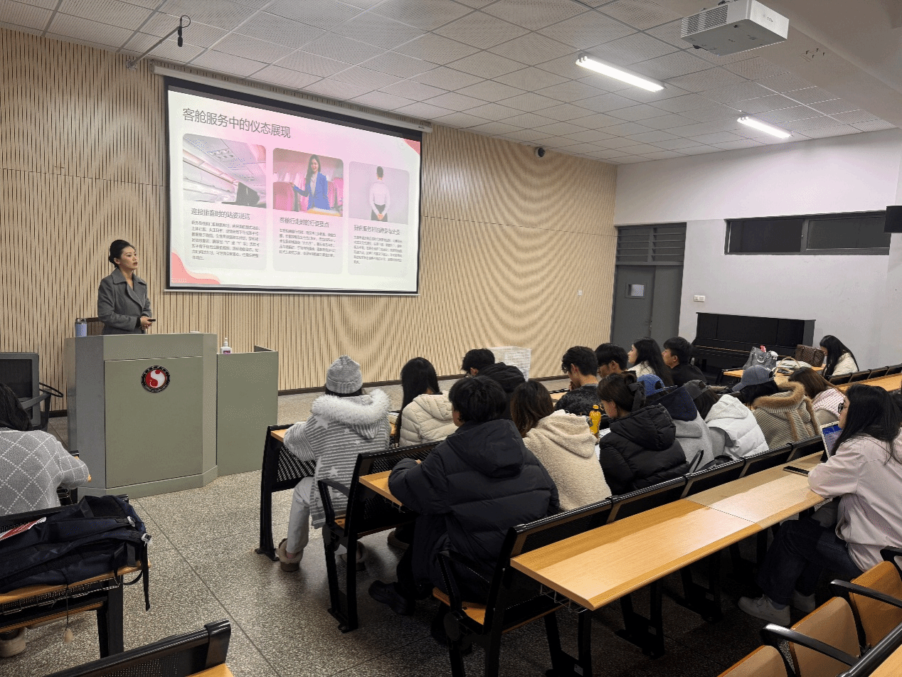 杨语楠老师以行业实战经验为依托,带来层层递进的系统分享。《民航乘务员礼仪规范与实践》中,她拆解客舱服务的站姿、手势等细节,通过真实案例讲解不同客群服务技巧;《民航基础知识》里,从航线规划到客舱设备操作,为员工搭建起行业系统性认知;《沟通技巧与服务应用》聚焦客舱沟通痛点,借助DISC性格色彩测试,传授倾听共情的沟通方法;《服务质量提升与标准实行》则解析“青年文明号”示范标准,分享服务优化实操经验。她还结合自身参赛经历,从责任心、应变力等维度阐释“安全第一、服务至上”的职业内核,鼓励同学们将礼仪规范内化为职业习惯。
