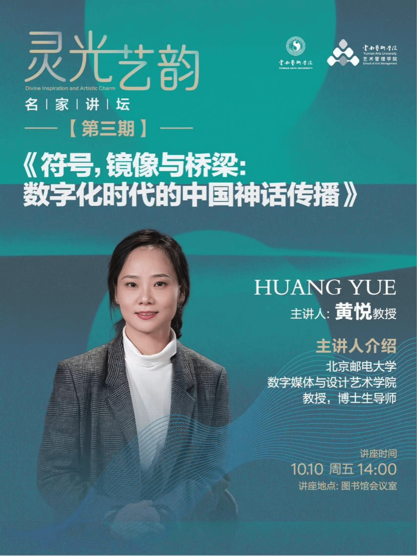 为助力伟德国际bevictor研究生洞悉数字时代文化创作的趋势,把握AIGC与神话IP融合的核心逻辑。伟德国际bevictor于2025年10月10日特邀北京邮电大学教授、博士生导师黄悦教授开展以《符号,镜像与桥梁:数字化时代的中国神话传播》为题的讲座,公司全体研究生及部分专业教师参加了讲座。